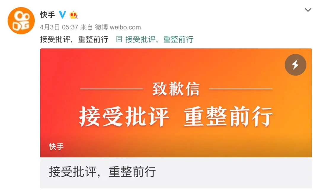 4月5日,快手官微发布消息称,从今天上午9时起,将连续5天在发现页进行固定的视频引导。官方表示,“这些天我们一直在反思,如何通过这次整改让快手能变得更好。由此给您带来的不便,我们深表歉意。 ”