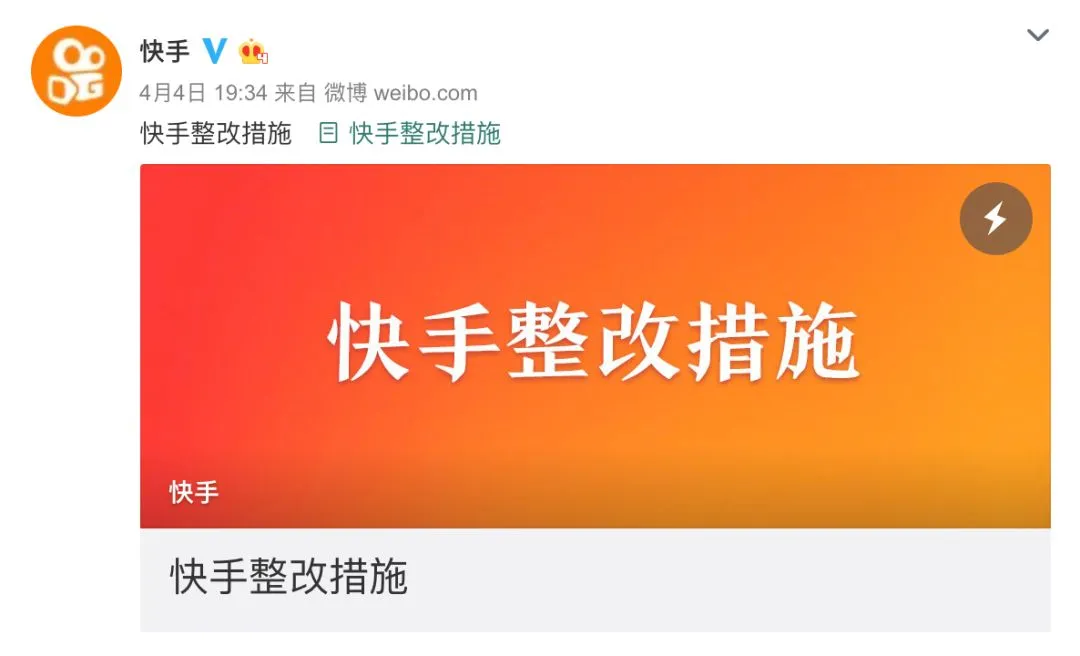 4月4日,国家广播电视总局发布通知,要求快手依据《互联网视听节目服务管理规定》采取整改措施。快手称,诚挚接受政府管理部门的批评,随即组织全公司管理人员进行了深刻反省,并在官微置顶发布整改措施。