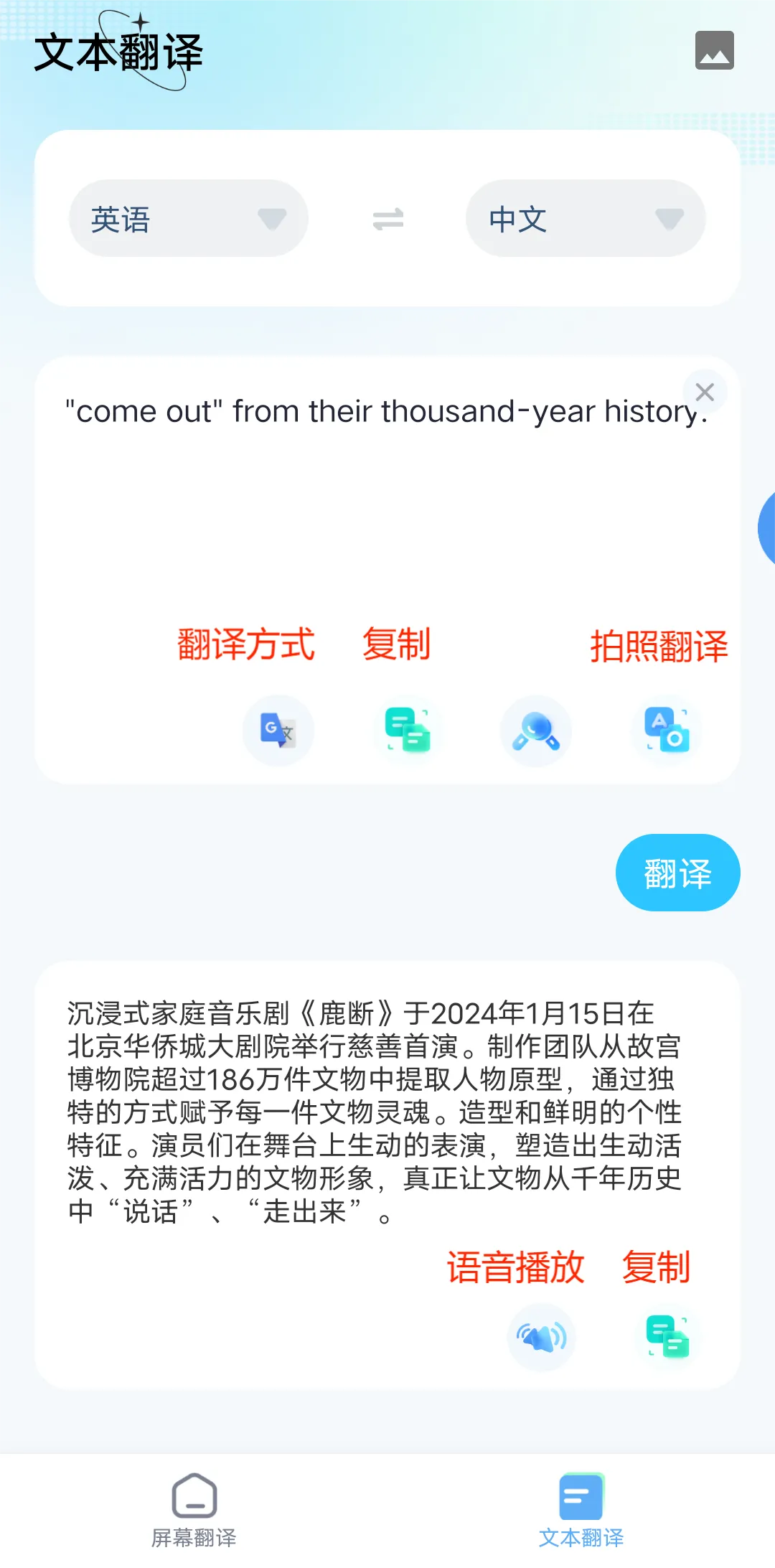 同时软件也支持文本翻译,具备“拍照识别翻译”和“语音发音”的功能,提供更全面的翻译体验,翻译的结果可以一键复制和播放发音。
