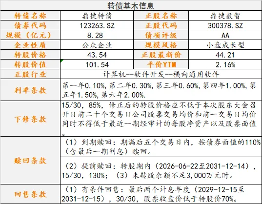 鼎捷转债发行规模8.28亿元,评级AA。股票最新市值约120亿元,股价年化波动率64%,PE为75,小盘成长型股票。公司主要从事工业软件,为制造业、流通业企业提供数字化、网络化、智能化解决方案。公司近年来债务负担较低,但盈利能力有所承压。综合看鼎捷转债正股具备弹性,机构关注度较高,但估值已处于较高水平。今日市场标志性高价次新债浩瀚转债突发大幅度下杀,可能对新券无脑高定价的情绪产生一定影响,密切关注明日上市的两只新券的定价结果。
