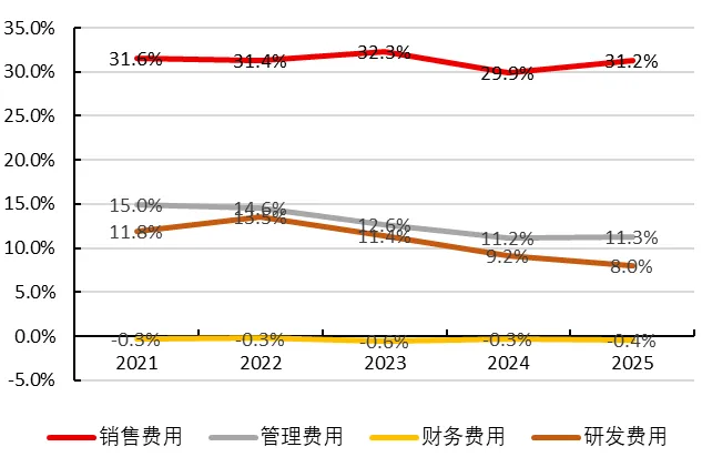 毛利率、净利率双降:2024年公司毛利率达58.25%,较上年同期降低3.65个百分点,主要是受产品结构变动影响。随着公司通过优化内部管理体系、增强管理提效等方式加强费用管控,2024年公司销售和管理费用率分别较上年同期降低1.34和1.21个百分点,而虽然公司持续投入研发,但由于公司重点加强数智相关的投入,导致研发资本化占比提升,推动研发费用下降,2024年公司研发费用率较上年同期降低2.86个百分点。受益于费用管控,公司净利率保持稳定,2024年净利率为6.80%,较上年同期仅降低0.17个百分点。