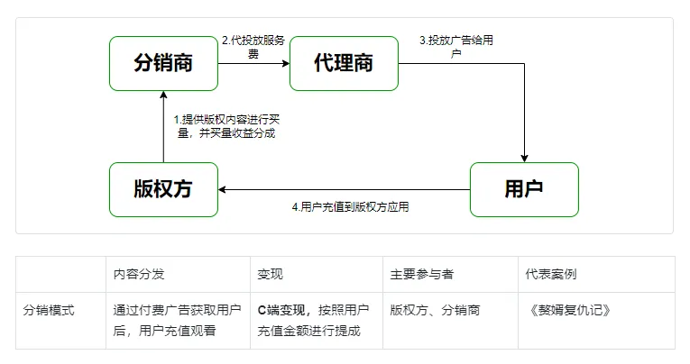 分销商:将版权方的短剧内容通过付费广告投放获取用户充值,并按照一定比例(例如分销方:版权方=9:1)和版权方分成,需要分销方有较强的广告买量能力。 -