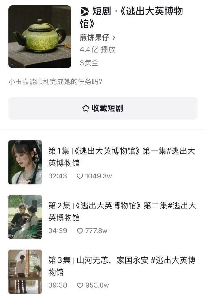的确如此。比如2023年抖音爆款微短剧《逃出大英博物馆》聚焦文物回归话题,契合「文化流失海外」相关的社会热点,一经播出,便引爆舆论。
