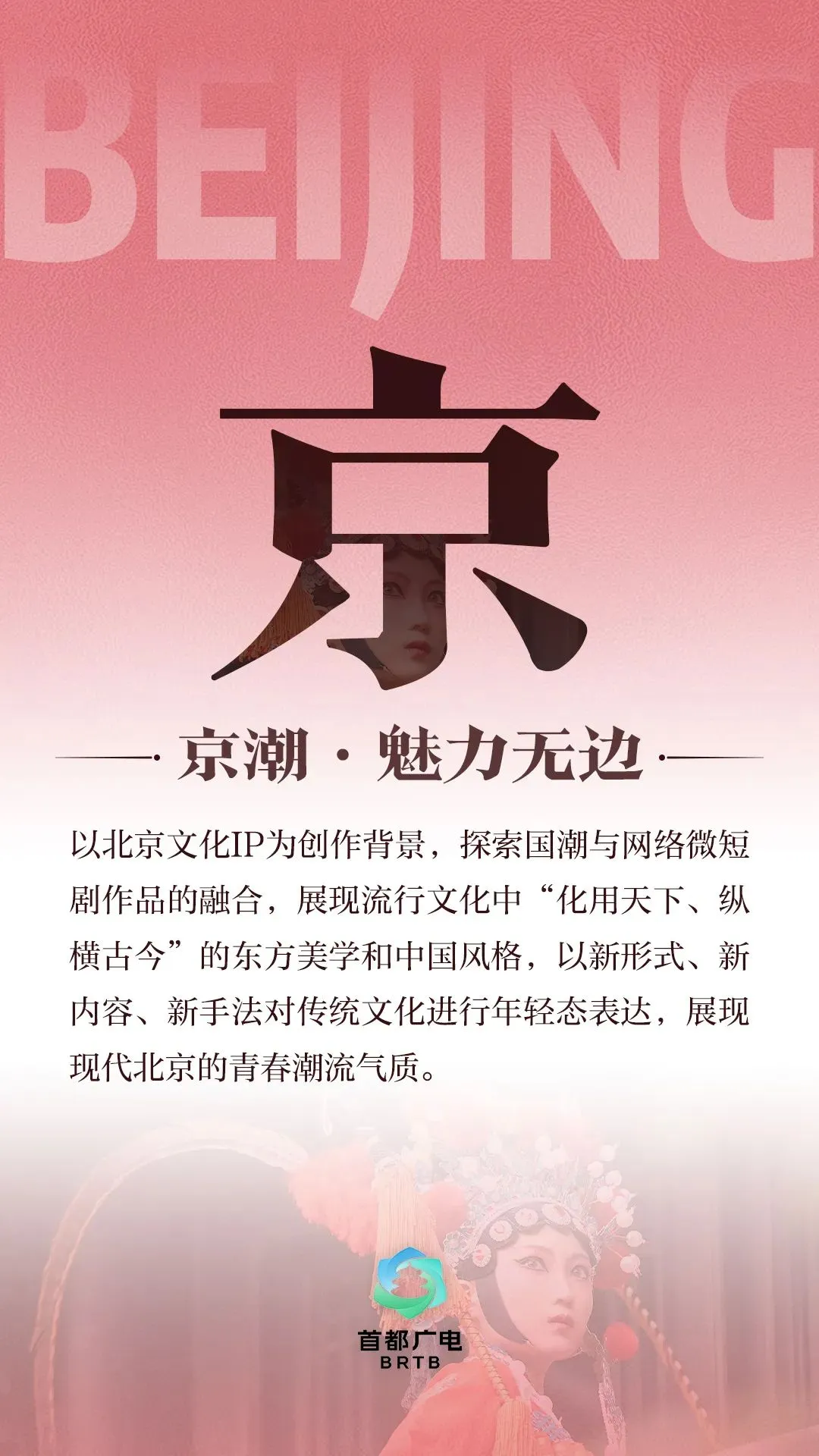以北京文化IP为创作背景,探索国潮与网络微短剧作品的融合,展现流行文化中“化用天下、纵横古今”的东方美学和中国风格。从文物、古建筑、古诗词等“国家宝藏”中取材,结合北京地域文化,打造一批具有“京潮”特色的微短剧作品,在传统文化、现代理念、先进技术的相互融合中推动文化传承;同时围绕北京特色博物馆、图书馆、展览馆等公共文化空间和知识场所,以及城市副中心、亮马河等新时代北京网红打卡点,展现现代北京的青春潮流气质。