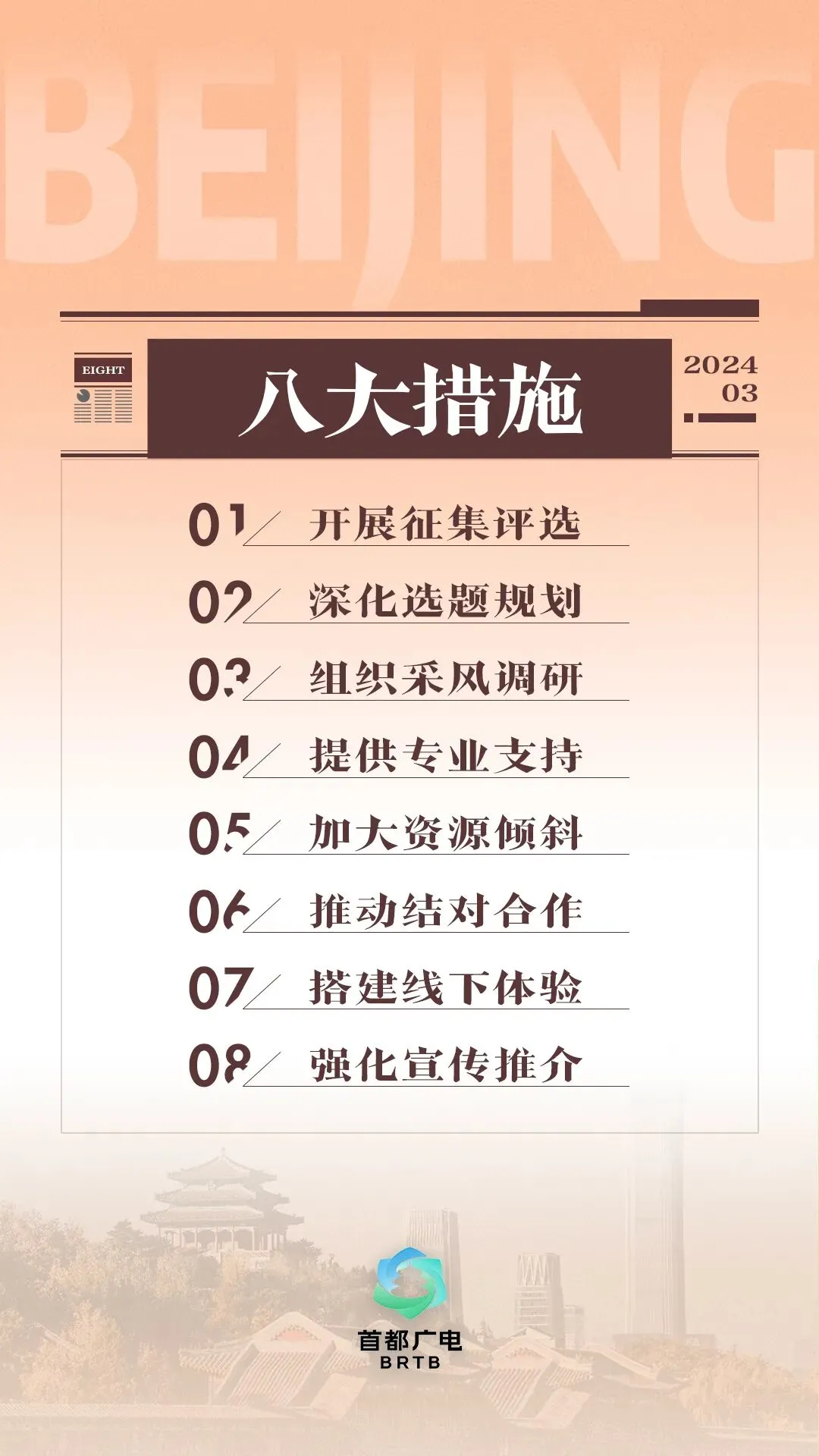 (一)开展征集评选。北京市广播电视局于 2024年3月15日举办发布仪式,正式启动跟着微短剧去旅行·“短剧游北京”创作计划。在2024年3月15日至11月30日期间,分两批征集展现京貌、京韵、京创、京潮、京尚的微短剧,组织专家进行评选,并分别在第二届北京网络视听艺术大会期间和2024年底前发布表彰,同时积极推荐优秀作品参加国家广电总局100部“跟着微短剧去旅行”主题优秀微短剧评选推优。