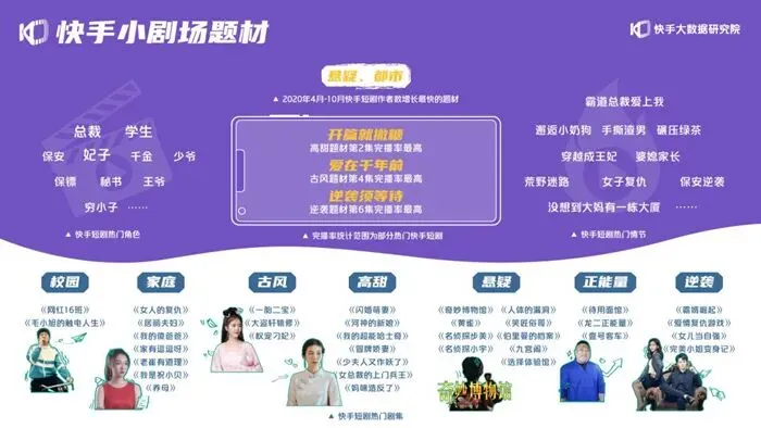 观众都喜欢看怎样的微短剧?2020年4月至10月,快手短剧作者数增长最快的题材分别是悬疑和都市,轻松的题材更能获得高线城市用户的青睐。女性观众爱好高甜、校园、古风、逆袭、友情等题材,男性观众爱好正能量、搞笑、都市、连载动画、魔幻等题材。