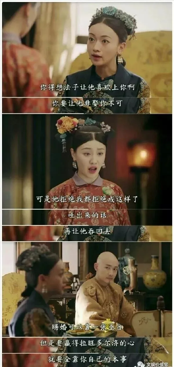 除了儿女一辈换上了新人主演,其他角色都是《延禧攻略》的原班人马,吴谨言和聂远甚至都不能算客串,因为戏份真的还不少。但这个番外实在算不得精品,因为剧情太儿戏,和于正在优酷的综艺《演技派》里套拍的短剧《紫禁城里的小食光》一样,都能看得出,他要将花大价钱收藏来的清宫全套服道化,循环再利用,直到赚回本钱为止的小心机。