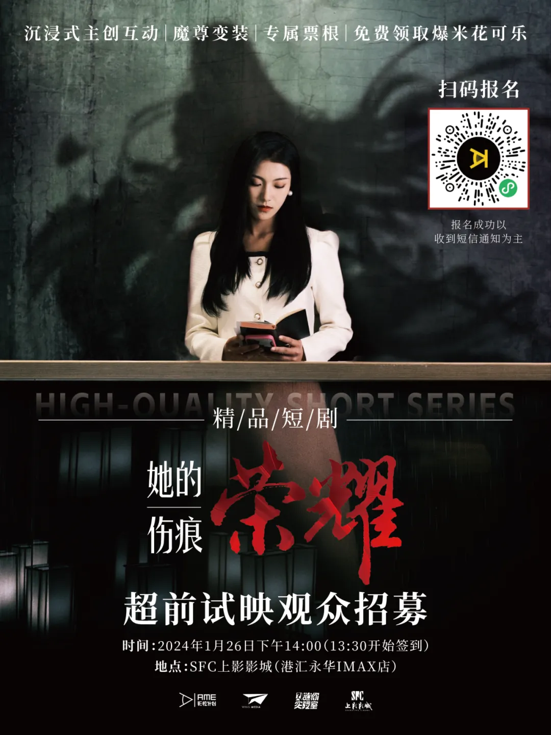 由AME影视计划与杭州薇映影视文化传媒有限公司联合出品、零矩阵(西安)文化传媒有限责任公司制作、华数传媒—谜你实验室联合宣发的竖屏精品短剧《她的伤痕荣耀》将于1月26日在上海SFC上影影城(港汇永华IMAX店)举行超前试映暨新片发布会。