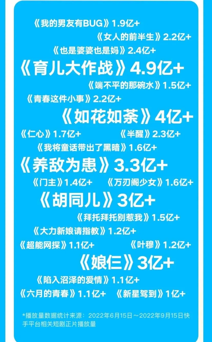 同样,快手短剧的质量升级与题材拓宽带动了更多用户增量。截止2022年7月底“快手光合大会”,快手短剧日活用户已达2.6亿,超过50%的快手短剧日活跃用户日均观看10集以上短剧。