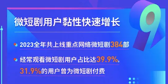 《中国网络视听发展研究报告(2024)》显示,在用户经常收看的类型中,微短剧以39.9%的用户占比排名第三,受访用户中31.9%的用户为微短剧付过费。短剧有了成为影视内容“主力军”的潜力。