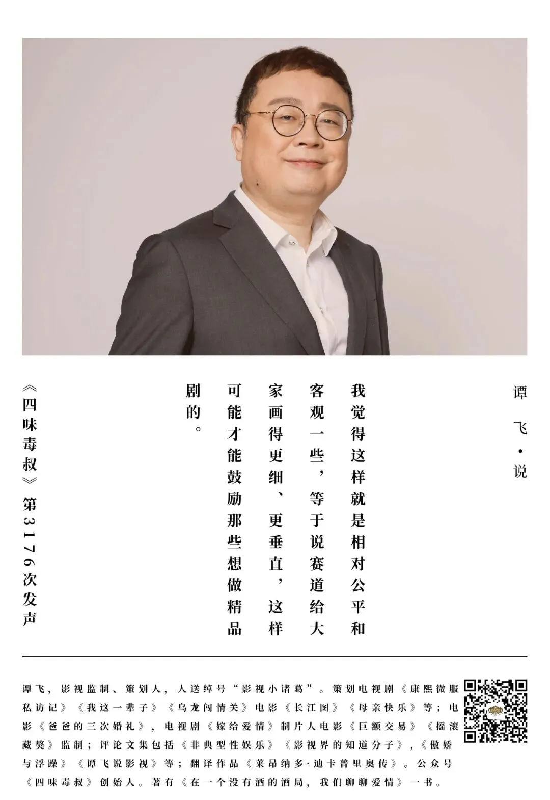 谭飞:我觉得这样就是相对公平和客观一些,等于说赛道给大家画得更细、更垂直,这样可能才能鼓励那些想做精品剧的。否则大家都说我这做得没声响,没人看我就不做了。