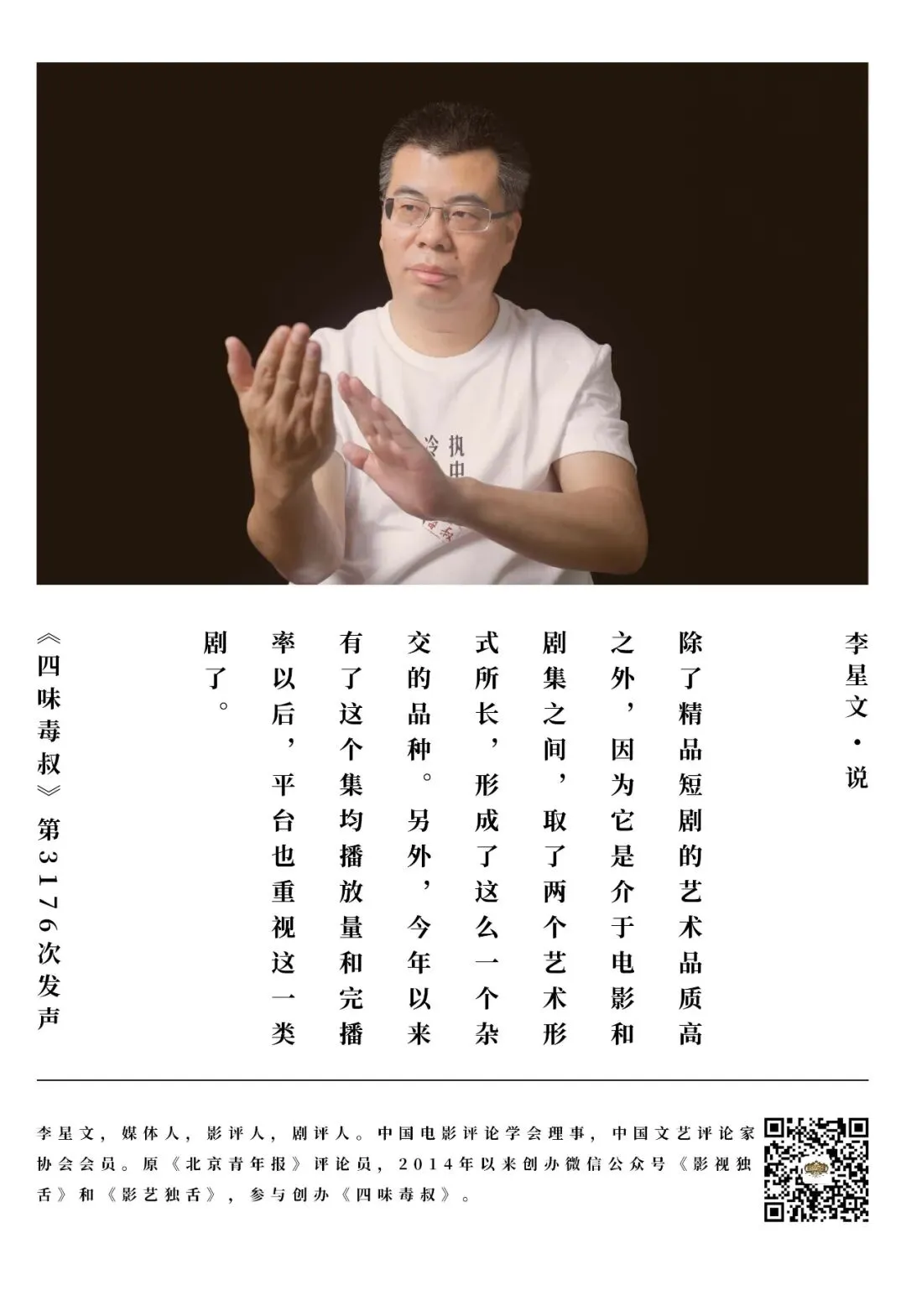 李星文:你说得太对了,我为什么说精品短剧是我们剧集行业的终极出路呢?除了它的艺术品质高之外,因为它是介于电影和剧集之间,取了两个艺术形式所长,形成了这么一个杂交的品种。我们袁隆平的杂交水稻产量最高,最受大家欢迎,这个也是我觉得这里头是有杂交优势的。另外,今年以来有了这个集均播放量和完播率以后,平台也重视这一类剧了,我不要求你跟《狂飙》去PK总播放量了。你只要集均播放量高,我也认可,我也给你买单,我还鼓励你下次接着来。所以就说是无论咱们从艺术评判的角度去看,还是商家从生意的角度去算账,这个模式现在基本上走通了,走通了以后,再加上我觉得它能对抗短视频和微短剧。所以这三个指标凑起来,我觉得它是一个终极出路。