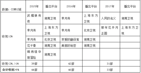 电视台收视率下跌明显,2017年单个上星频道收视率超过1%的电视剧总量为33部,较上年下跌28%。收视率超过2%的仅有2部,在1%-2%之间的为31部,这些数据与前几年相比均呈下跌趋势。
