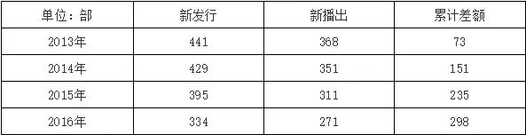 2013 -2016年,新增库存累计达298部,不计算2016年新增发行数,仅库存一项就已超过当年271部的播出量,产能严重过剩,资源严重浪费。