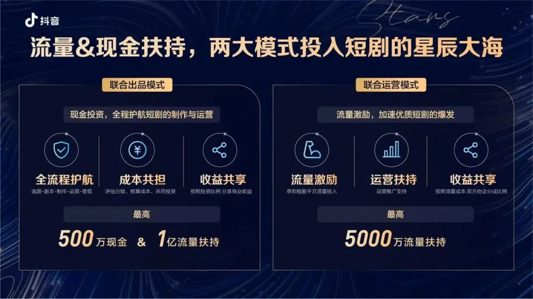 第一种联合出品模式,指抖音以现金投资的方式与制作方联合出品,最高可获500万现金和1亿流量扶持,这一模式主要针对不少于20集数,单部总时长不少于80分钟的连续剧情短剧,并提供“选题立意、剧本创作、内容制作、账号运营”的全流程支持;