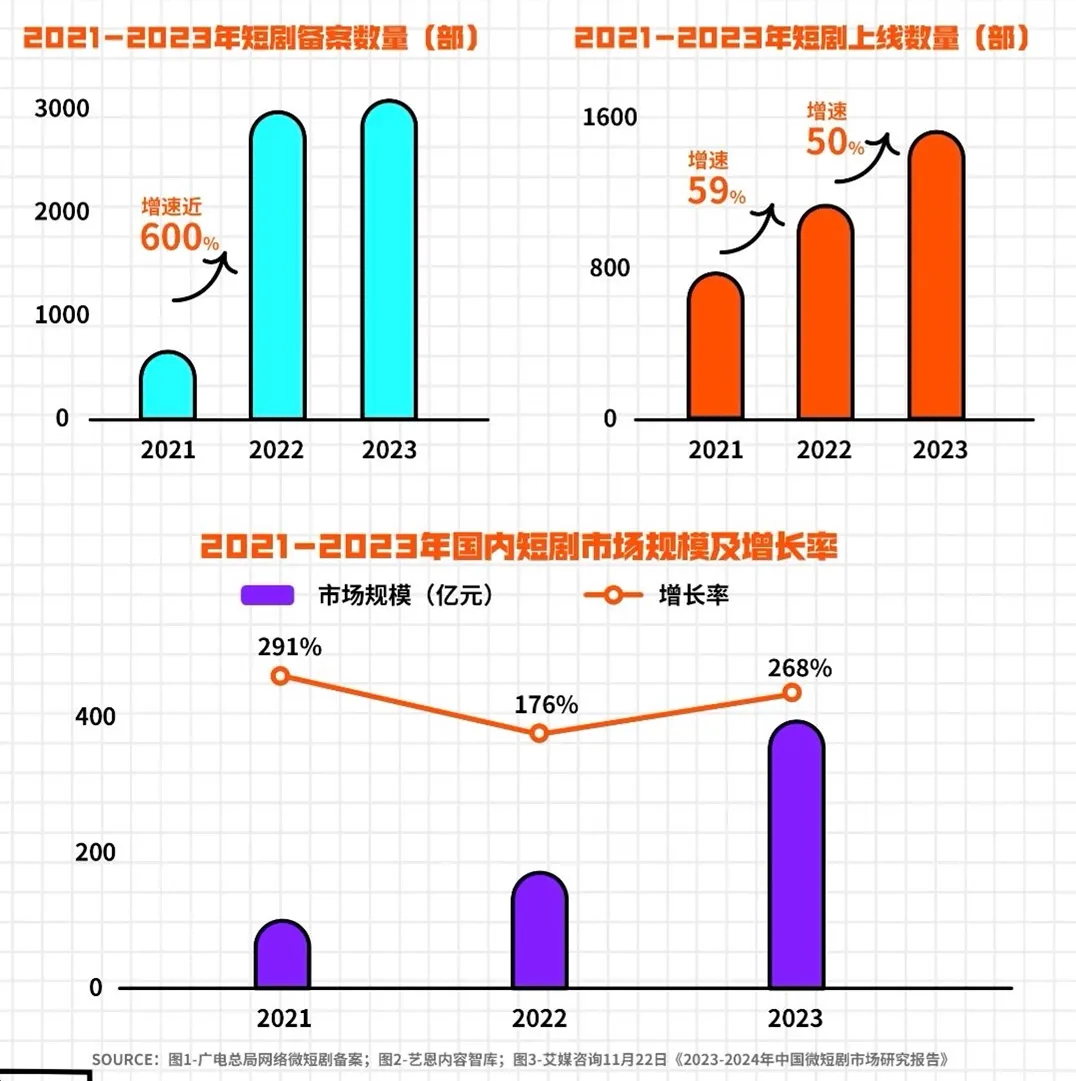 体量轻、周期短、情节爽的短剧与去中心化的流量场域深度结合,构建出高效传播、快速迭代的内容消费场景。从短剧数量、题材的指数级增长到狂飙的小程序短剧,再到短剧出海热潮的兴起,这一视听新势力向来不乏新故事。在短短一年间,短剧市场规模倍速增长,掘金队伍持续壮大。