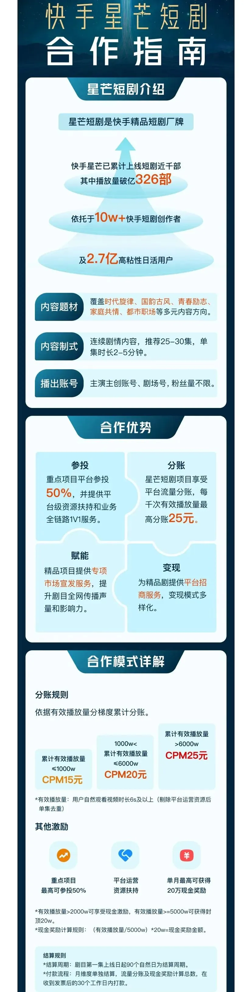 运营侧,快手短剧通过对优质内容进行热点话题运营,开辟多元、丰富的分发场景,增加短剧的曝光机会;变现方面,快手不仅借助磁力万和、光合计划等激励政策,为创作者提供多条变现渠道,还为创作者提供强大的品牌资源和多渠道营销支持。快手星芒政策也公布了新一轮升级,为精品优质短剧项目提供的参投金额从原本的最高40%提高到50%。