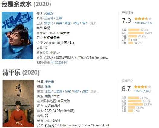 《我是余欢水》豆瓣评分7.3,23W+人评价,而《清平乐》豆瓣评分6.7,仅12W+人评价。