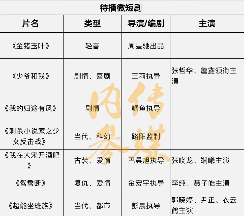 目前待播的微短剧达7部以上,包括张晓龙和斓曦主演的《我在大宋开酒吧》、李纯主演的《智鸯断》、郭晓婷和尹正主演的《超能坐班族》、张哲华、詹鑫主演的《少爷和我》等。