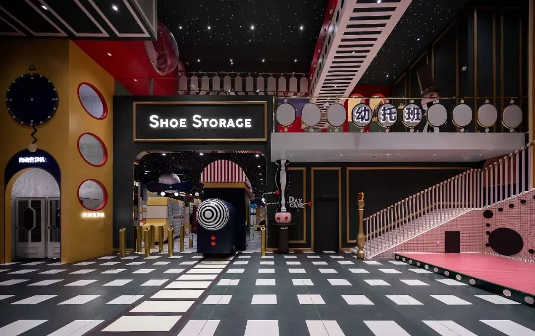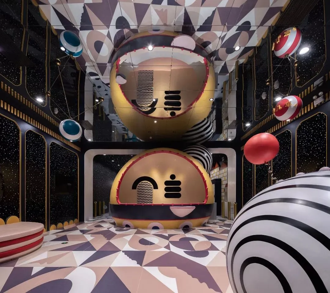设计师引借游戏npc的概念,别出心裁地设计了一些卡通人偶装置,卡在人群动线的各个节点,它们承载了指示标牌功能,为空间的故事情节补充了生动的角色。