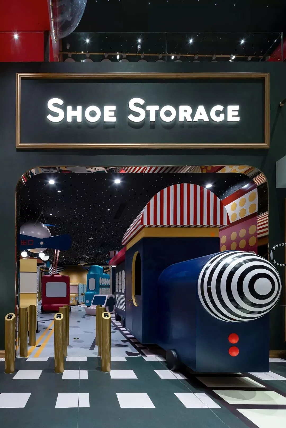 跟随着延续空间感的星空隧道来到换鞋区,汽车造型的鞋柜交错穿插的排列阵型,不仅让陈设静物的空间内徒增了一种动态感,更有一种奇幻的吸引力,仿佛误入了爱丽丝梦游仙境。