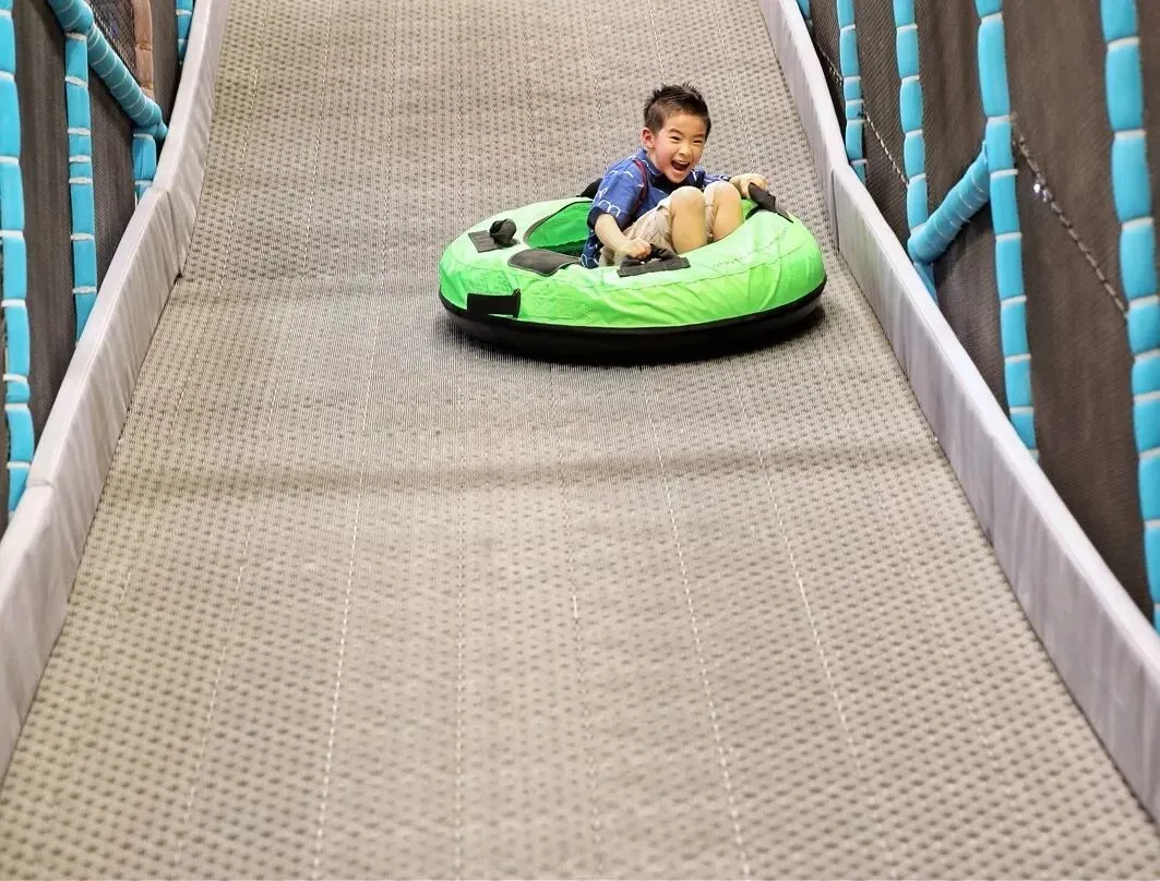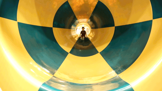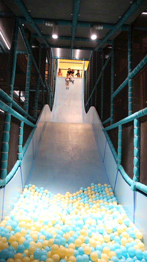 还有90°垂直滑梯、滚筒滑梯、大波浪滑梯……光是滑梯好几种,一个比一个惊险刺激!