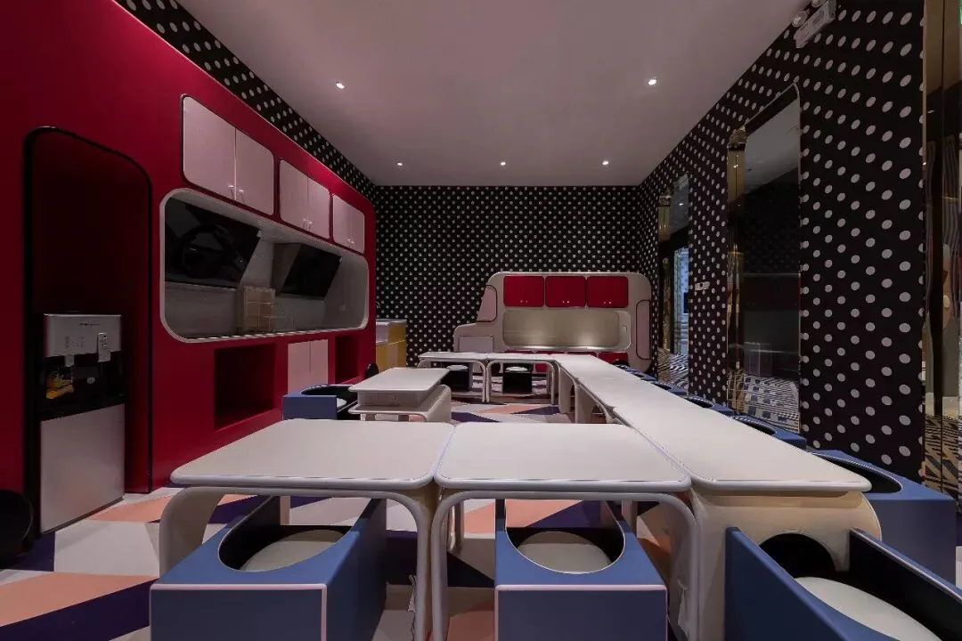 充满神秘感和奇幻色彩的星空背景与怪趣十足的迎宾台,在镜面吊顶的叠加作用下,为前台接待区营造了一种突破次元的超现实感,仿佛穿越到了一个只存在于童话之中的梦幻王国。