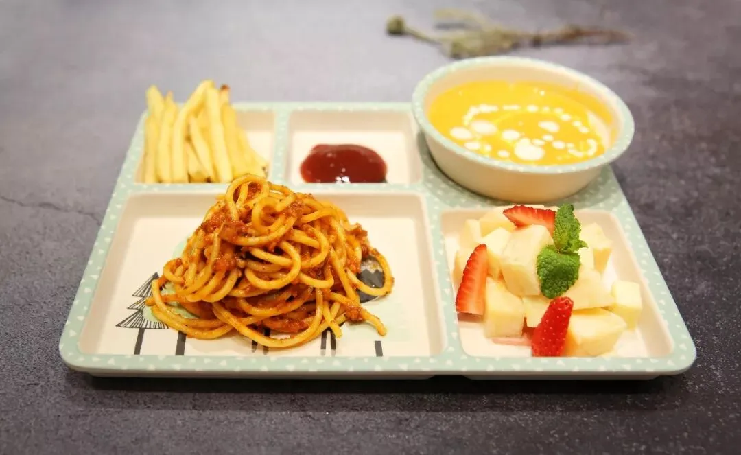 为宝宝们专门设计的儿童餐看起来也是让人食欲大开,主食搭配薯条、浓汤和新鲜水果,健康美味,营养均衡。