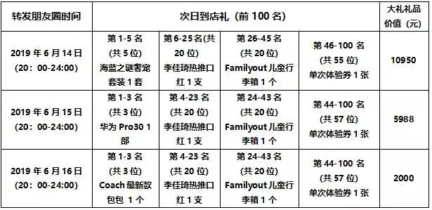 3.到店排队及礼品领取时间:2019年6月15日10:00-11:00,2019年6月16日10:00-11:00,2019年6月17日10:00-11:00。