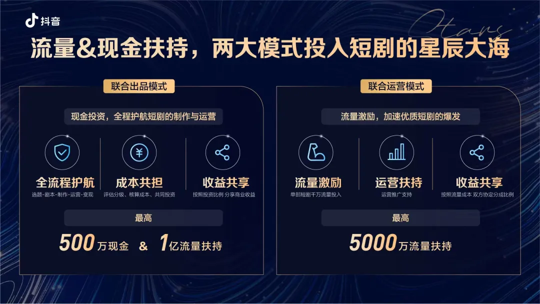 据介绍,“辰星计划”包含联合出品、联合运营两类合作模式。联合出品模式,指抖音以现金投资的方式与制作方联合出品,并提供“选题立意、剧本创作、内容制作、账号运营”的全流程支持;联合运营模式下,由创作者和机构负责微短剧开发制作,抖音提供最高五千万级流量扶持和全方位的运营支持。