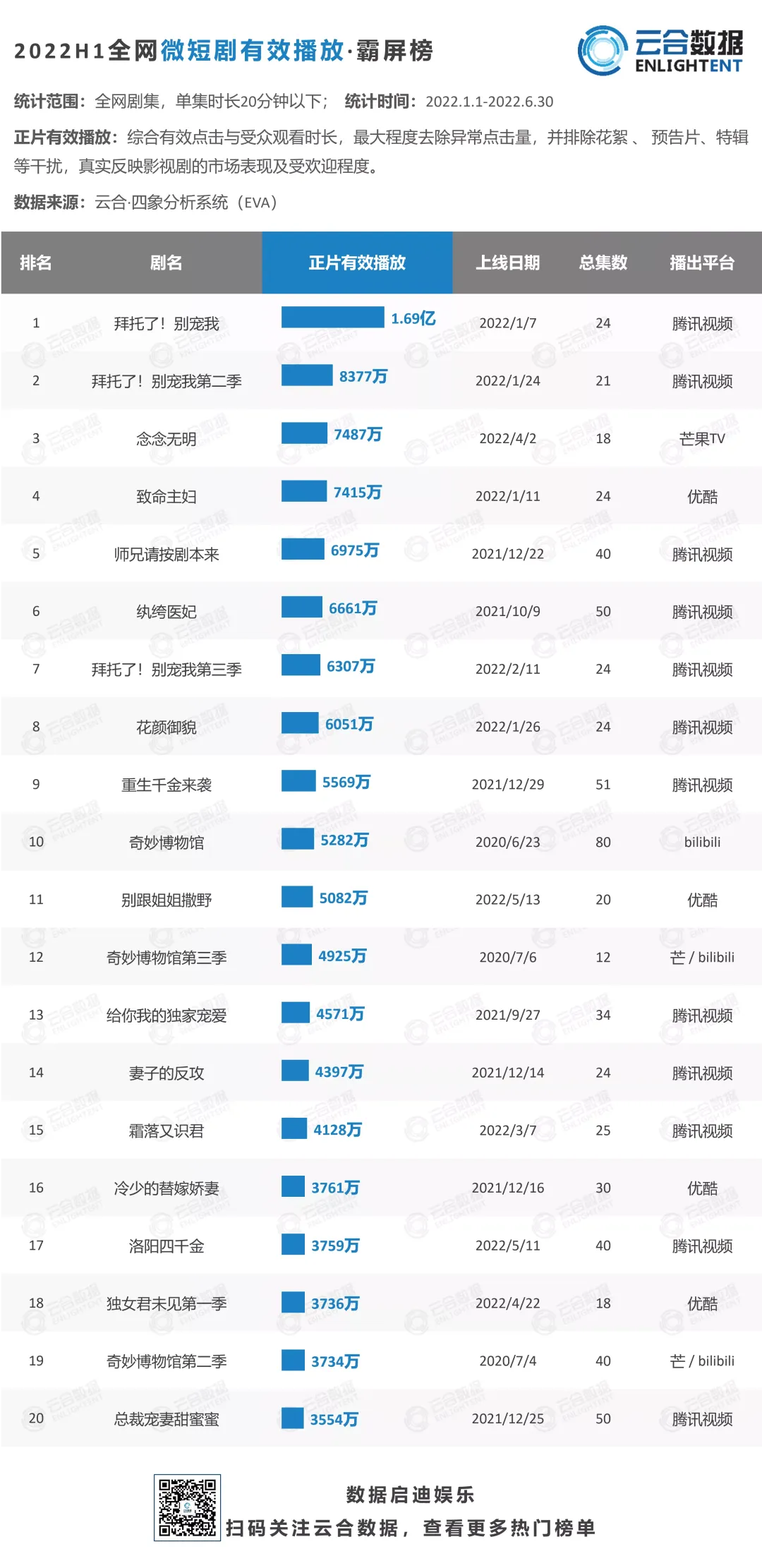 这种坚持与进取,也为腾讯视频微短剧带来了更多的收获:从平台竞争力来看,根据云合数据,2022H1全网微短剧有效播放霸屏榜中,TOP10中有7部均来自腾讯视频,实现了作品口碑的成功转化。