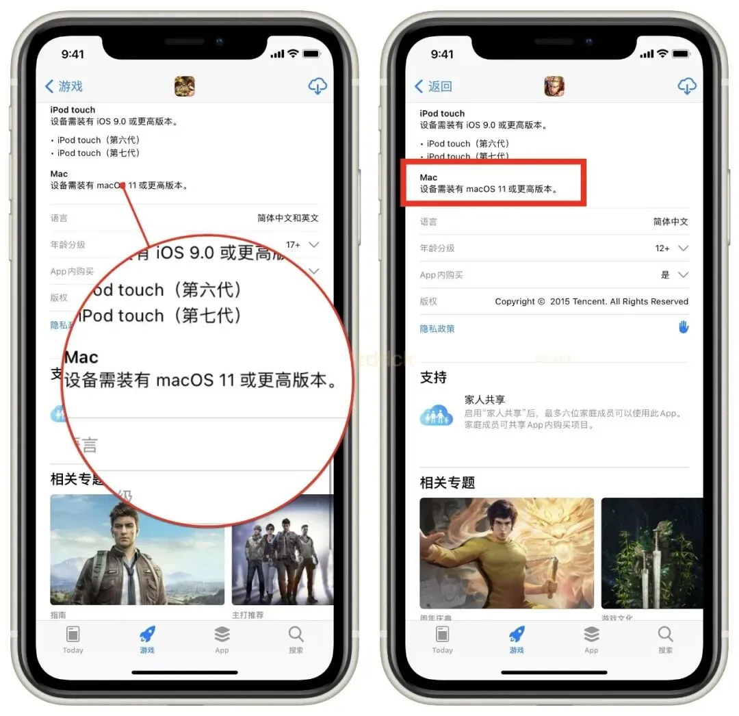 近日在苹果 App Store 中,几乎所有的 iOS/iPadOS App 都出现新的兼容设备提示:设备需装有 macOS 11 或更高版本。包括游戏类型的软件!这也就意味着海量iOS应用将一下子成为mac OS的一个生态。