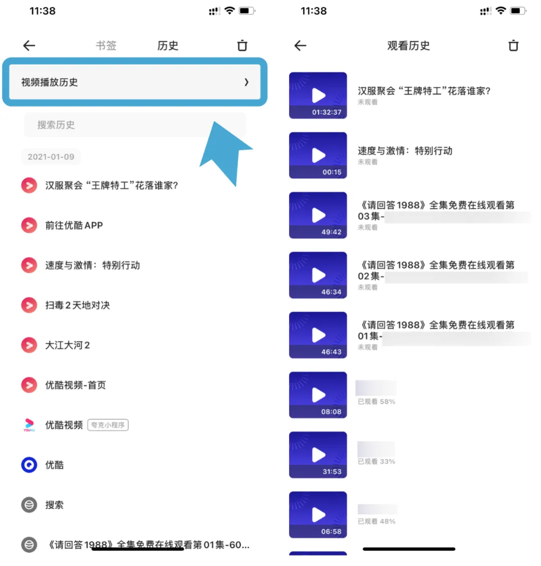 有意思的是,夸克居然还新增了视频播放历史记录,在书签/历史页面可以直接查看视频播放历史,方便快速找到看过的视频。