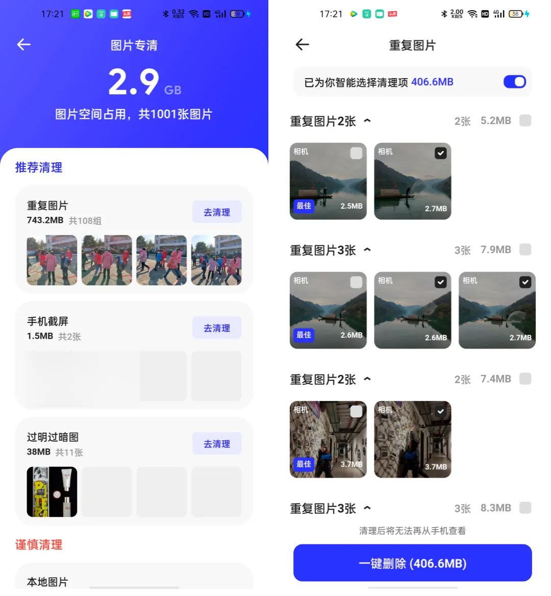支持一键清理和智能清理,可以智能识别并且清理手机中的重复视频、重复图片,释放存储空间。用安卓手机的小伙伴再也不用担心手机经常出现内存不足的提示了。