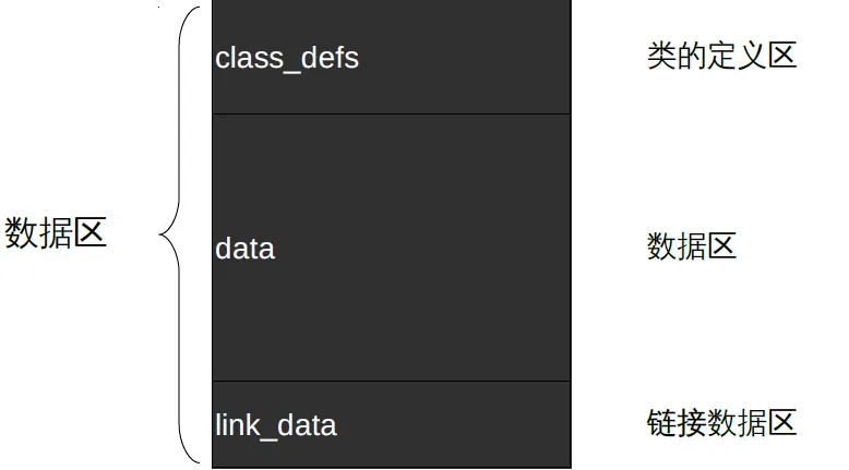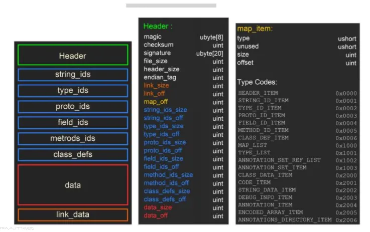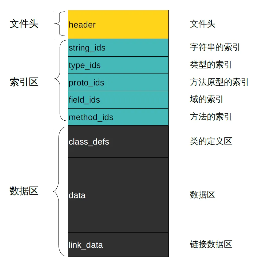 数据区一般包括类的定义区、数据区、链接数据区。类的定义区一般存放dex文件中一些类对象的声明,数据区则存放代码原数据,链接数据区一般提供从索引区到数据区的链接映射关系。