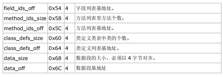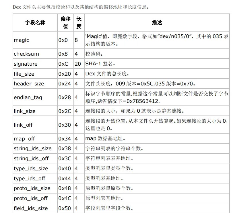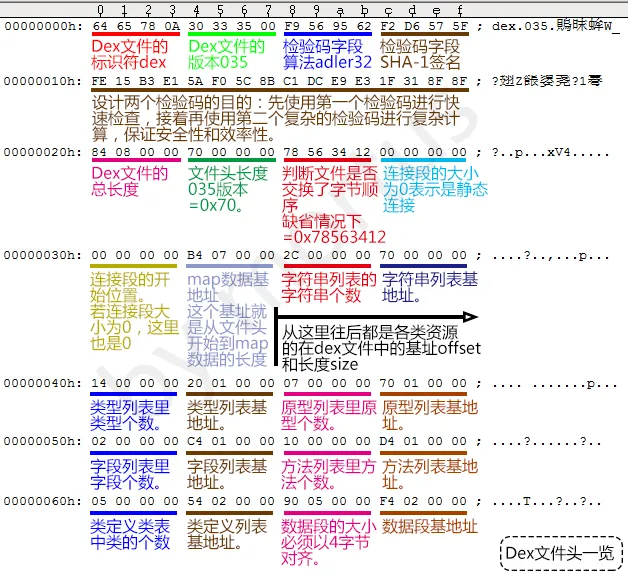 dex文件头一般固定为0x70个字节大小,包括标志、版本号、校验码、sha-1签名以及其他一些方法、类的数量和偏移地址等信息。如图所示: