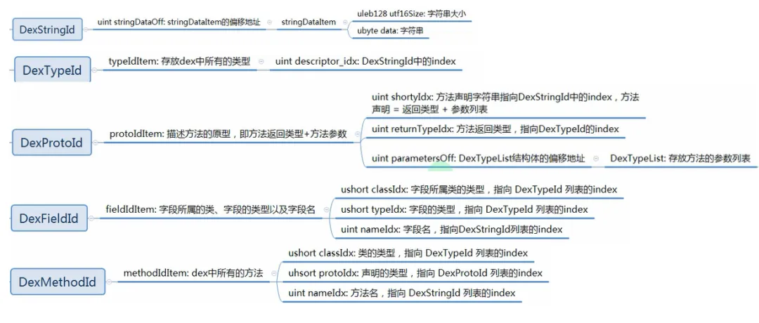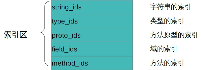 dex文件索引区主要是对一些字符串、类型、方法、域、方法的索引,方法可以查找到对应的数据位置。