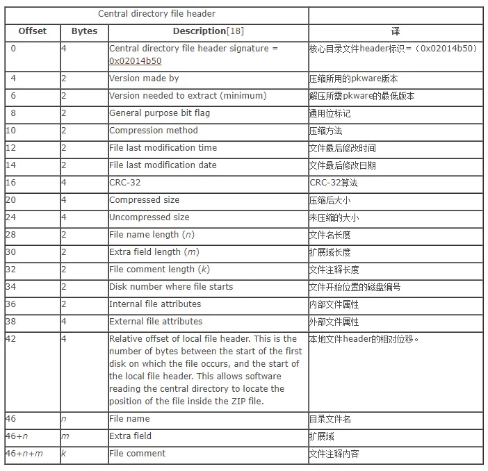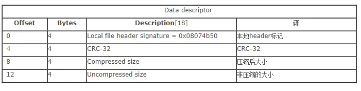 一般用于标识该文件压缩结束,该结构只有在相应的header中通用标记字段的第3位设为1时才会出现,紧接在压缩文件源数据后。这个数据描述符只用在不能对输出的 ZIP 文件进行检索时使用。例如:在一个不能检索的驱动器(如:磁带机上)上的 ZIP 文件中。如果是磁盘上的ZIP文件一般没有这个数据描述符。