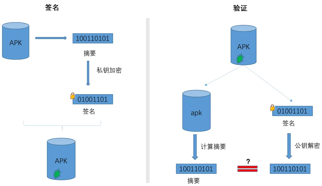 验证完整性:软件包管理器在安装应用前会验证应用摘要,如果破解者修改了 apk 里的内容,那么摘要就不再匹配,验证失败。