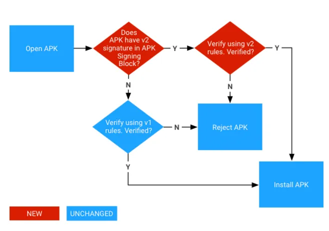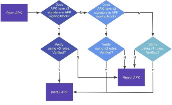 因为v2签名机制是在Android 7.0上版本才支持,因此对于Android 7.0以及以上版本,在安装过程中,如果v2 签名块,则必须走 v2 签名机制,不能绕过。否则降级走 v1 签名机制。