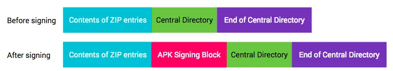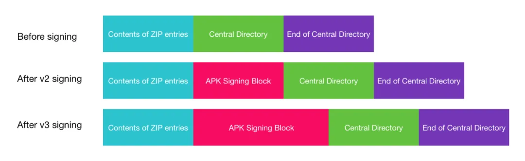 因此v2签名后会在源文件数据存储区和中心目录区插入APK 签名分块(APK Signing Block)。