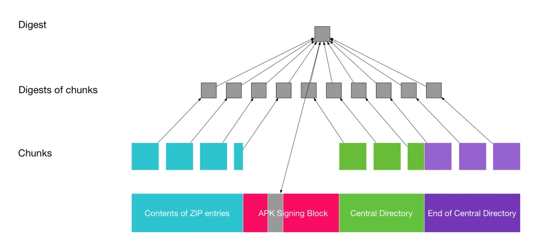 相比v1签名方案,v2签名方案不再以文件为单位计算摘要,而是以1MB为单位将文件拆分为多个连续的快(chunk),每个分区的最后一个快可能会小于1MB。v2签名流程如下: