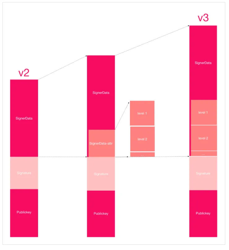v3 签名新增的新块(attr)存储了所有的签名信息,由更小的 Level 块,以链表的形式存储。