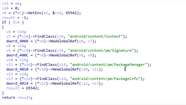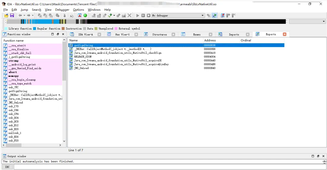 首先我们根据NDK注册定位到so层的入口点,去查找JNI_Onload函数,然后开始去查找上面的三兄弟。