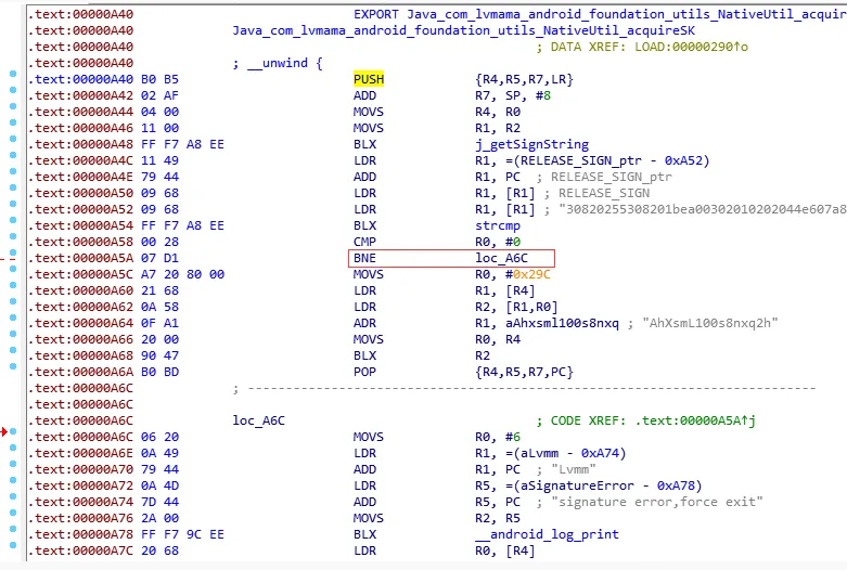 解决方案:这种情况,同样可以使用IDA或GDB进行动态调试确定到签名代码段,然后使用hook 注入技术或静态修改来进行绕过。