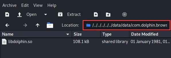 那么我们如何实现zip目录穿越了,我们是不是可以尝试去构建一个这样的zip包,去替换浏览器的下载包,并重命令去文件名,使得替换浏览器中的关键文件,这里我们就尝试去替换浏览器中的libdolphin.so文件。我们先查看该文件的位置: