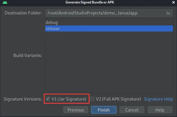 我们在Bulid—>Generate Signed APK中选择通过v1签名来生成apk文件。