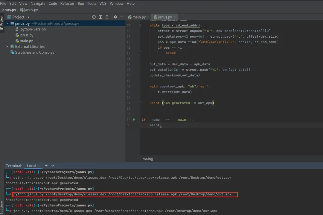 app-release.apk v1签名的初始样本classes.dex 修改后的dex文件out.apk 拼接后的apk文件janus.py 漏洞拼接代码