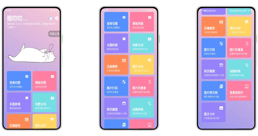 一个多功能作图软件,你可以用它将图片切成九宫格、也可以制作电影台词截图、进行长图拼接、图片大码、视频转GIF、制作氢壁纸等功能