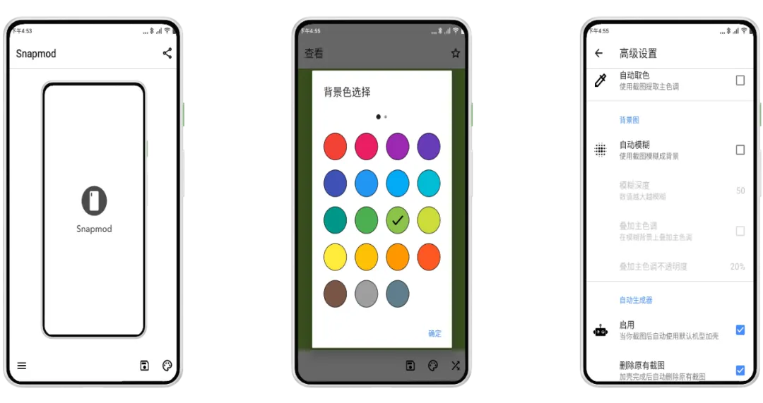 同时你也可以自定义机型,改变截图背景颜色,或者进行截图自动取色,也可以设置,截完图,自动删除原图,保留带有手机外观的截图。